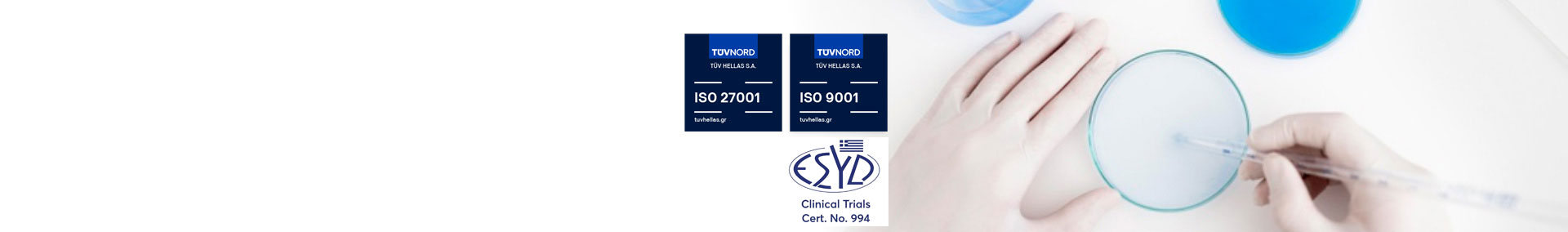 All our services are certified with the International Quality Standard ISO 9001:2015. The transport of biological samples from our partners' facilities is conducted by private vehicles, equipped with refrigerated chambers, applying all the rules of safe transport UN3373. The majority of our laboratory analyses are accredited by ESYD in accordance with the International Standard ISO 15189:2022 for the Accreditation of Clinical Laboratories. In addition, our Laboratory implements an Information Security Management System and is certified according to ISO/IEC 27001:2022.